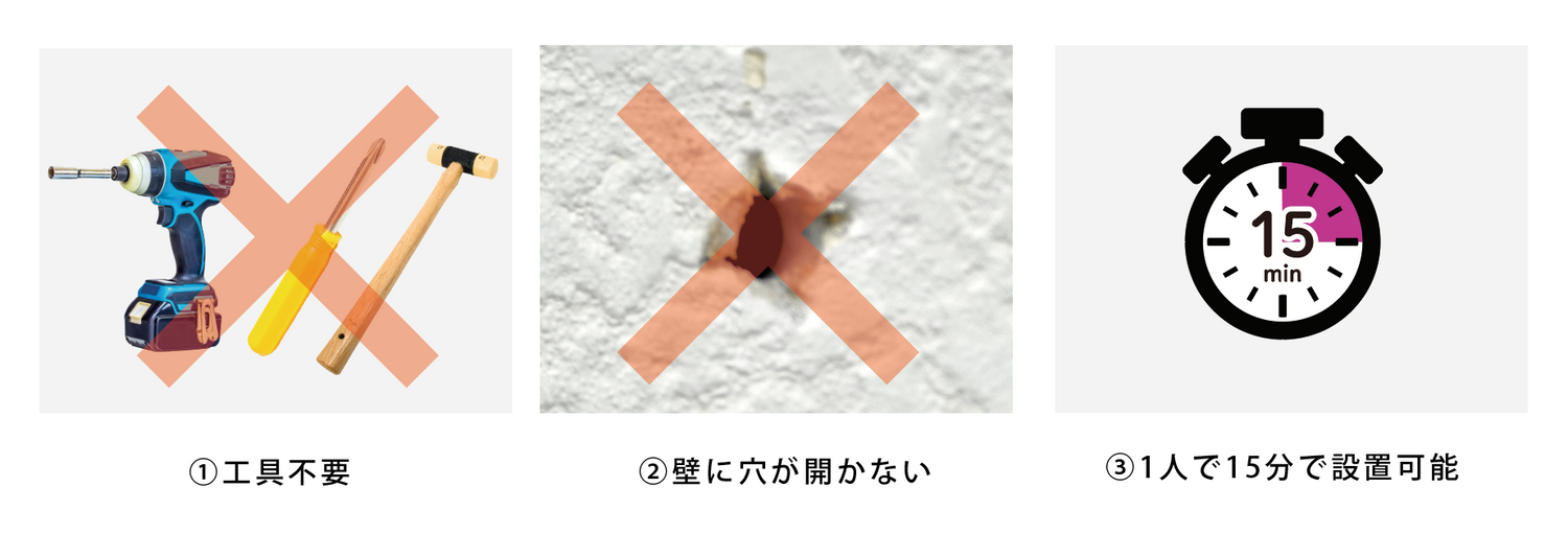 しかしながら、それらの多くは施工業者を呼んで設置してもらわないといけなかったり、賃貸住宅では壁に穴を開けなければいけないという理由で設置のハードルが高いものでした。